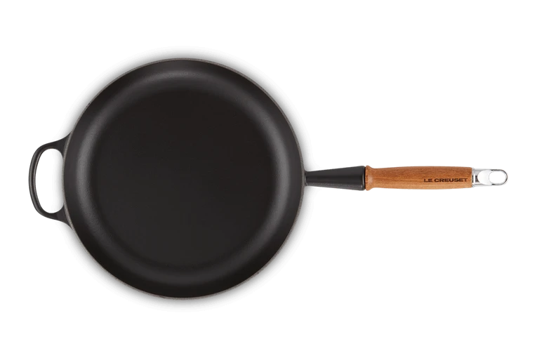 Het geëmailleerd gietijzer van de Le Creuset koekenpan weerstaat hoge temperaturen. Hierdoor is de pan zeer geschikt voor het bakken vlees en aardappels.