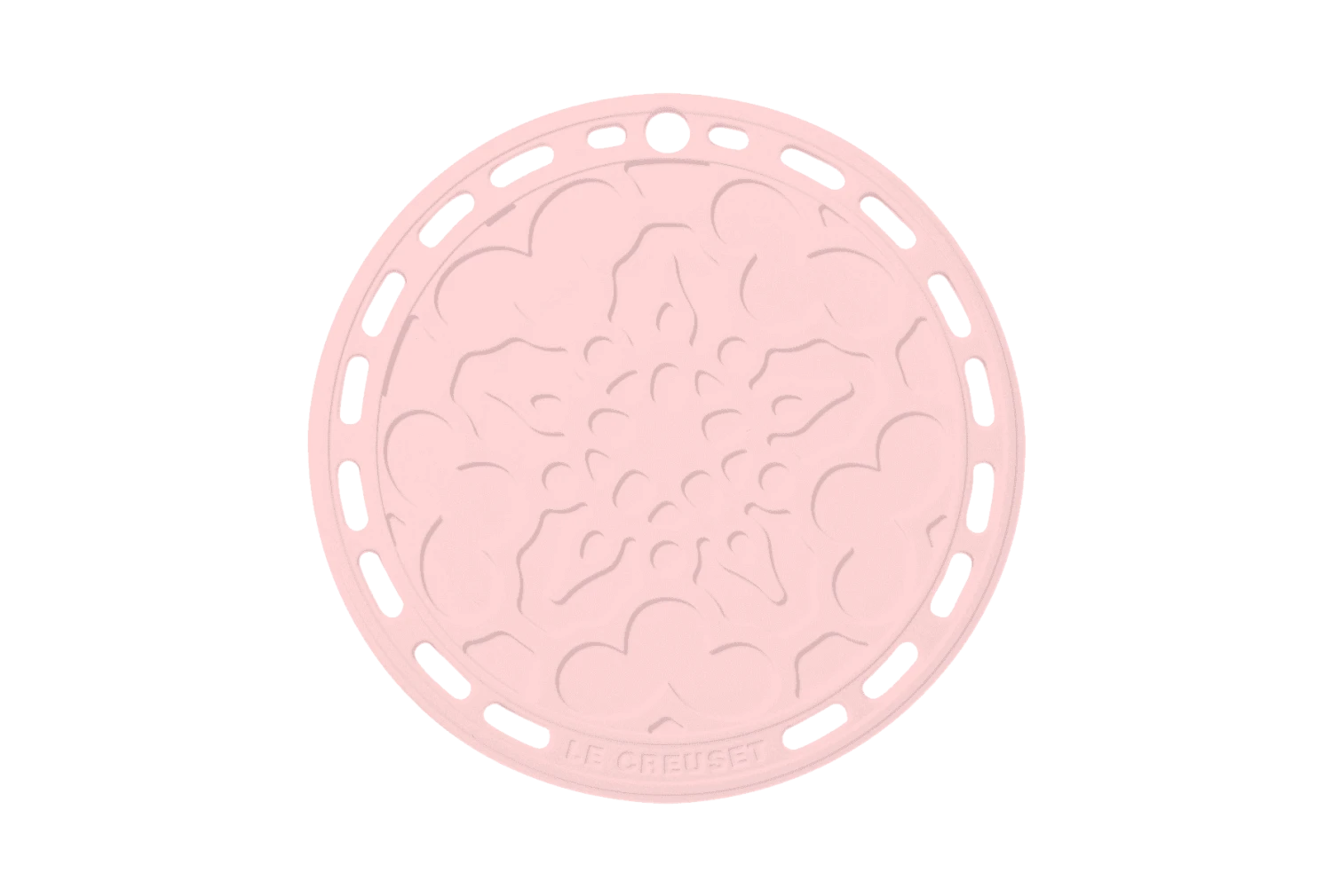 De Le Creuset pannenonderzetter is gemaakt van roze silicone en heeft een diameter van 20 cm. Gebruik de Shell Pink, flexibele lap als onderzetter of als pannenlap.