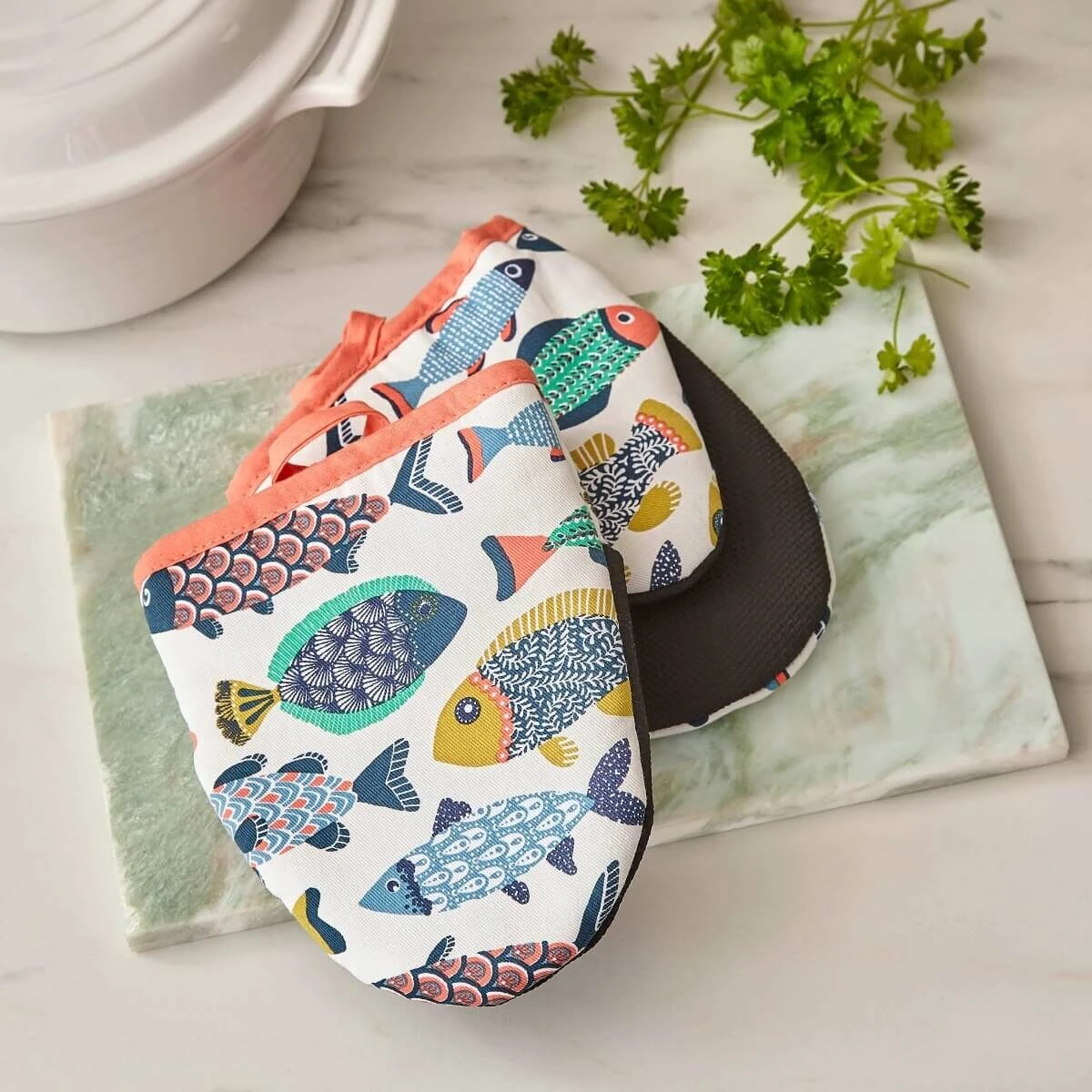 De oranje Double Micro ovenwanten set is perfect voor het hanteren van hete potten en schalen tot 100 graden Celsius. De handpalmen van neopreen beschermen tegen stoom en heet water en helpen uw vingers veilig te houden bij het hanteren van uw nieuwste culinaire meesterwerk. Geïnspireerd door een eenvoudige vakantie door aan zee fish and chips te eten, maakt de Ulster Weavers Aquarium Collectie gebruik van een nautisch palet van zeeblauw en groen gecombineerd met de sinaasappel, groen en groenblauw afgeleid van ligstoelstrepen en strandlakens.
